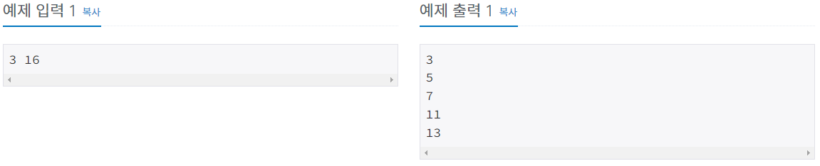 첫째 줄에 자연수 M과 N이 빈 칸을 사이에 두고 주어진다. (1 ≤ M ≤ N ≤ 1,000,000) M이상 N이하의 소수가 하나 이상 있는 입력만 주어진다.