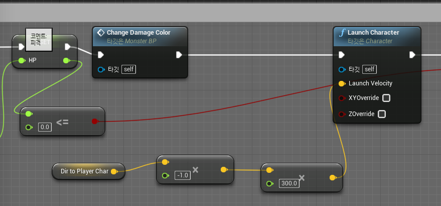 몬스터 블루프린트에서 몬스터가 피격받을 때 플레이어 캐릭터로부터 -300만큼 뒤로 넉백 되도록 Launch Character를 통해 설정한다.
