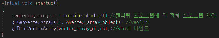 startup에서 변수 rendering_program 에 위의 쉐이더 파일인 compile_shaders() 를 연결하고