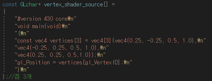 "const vec4 vertices[3] = vec4[3](vec4(0.25, -0.25, 0.5, 1.0),\n"