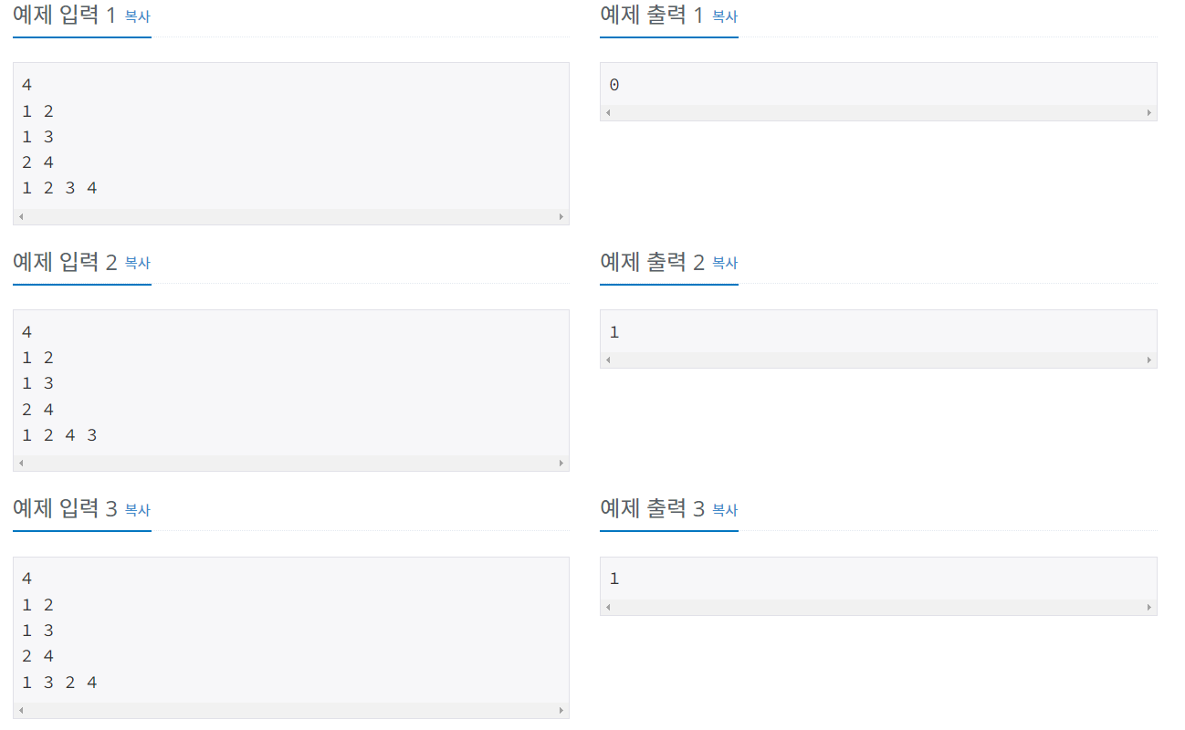 첫째 줄에 정점의 수 N(2 ≤ N ≤ 100,000)이 주어진다. 둘째 줄부터 N-1개의 줄에는 트리의 간선 정보가 주어진다. 마지막 줄에는 DFS 방문 순서가 주어진다. DFS 방문 순서는 항상 N개의 정수로 이루