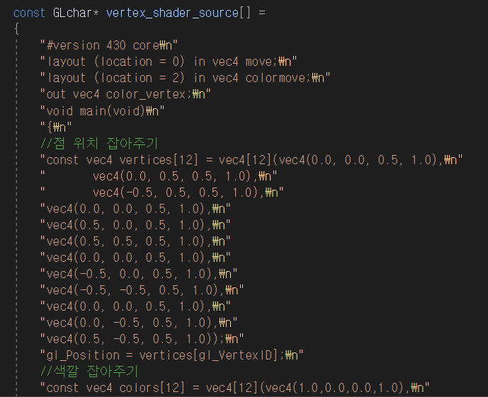 프로그램을 실행하고 삼각형을 그릴 때 총 12개의 점이 있으므로 이런식으로 glDrawArrays를 사용한다