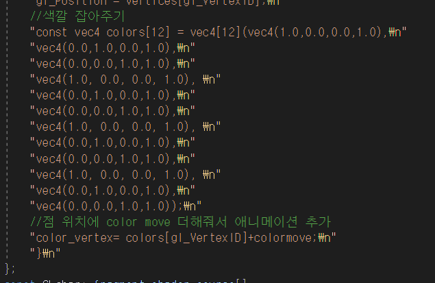 다음으로 각 점의 색을 지정해주고 각 점에 render함수에서 currentTime을 받아온 colormove를 더해줘 색이 틱마다 바뀌도록 설정해준다