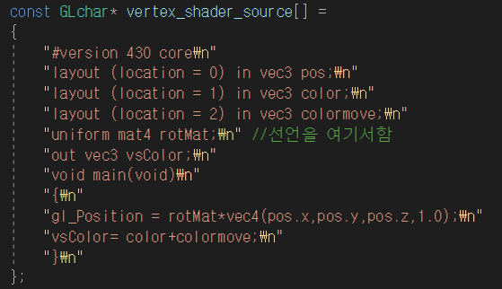 "uniform mat4 rotMat;\n" //선언을 여기서함