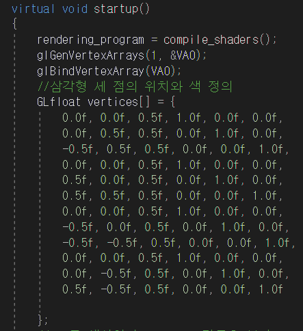 rendering_program = compile_shaders();//쉐이더 및 프로그램 재 컴파일 안하도록 일련의 과정 startup에 저장//리턴값인 program 이 들어옴