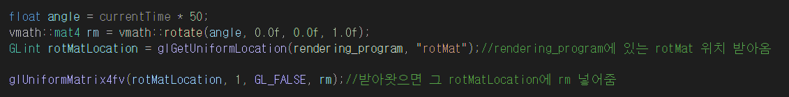 GLint rotMatLocation = glGetUniformLocation(rendering_program, "rotMat");//rendering_program에 있는 rotMat 위치 받아옴
