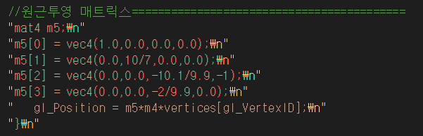 " gl_Position = m5*m4*m1*vertices[gl_VertexID];\n" // 오른쪽vertices[gl_VertexID] 점의 위치