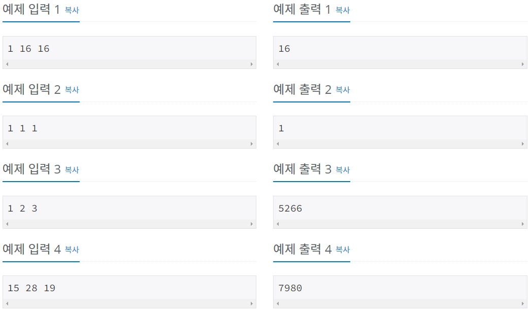 첫째 줄에 E S M으로 표시되는 가장 빠른 연도를 출력한다. 1 1 1은 항상 1이기 때문에, 정답이 음수가 나오는 경우는 없다.