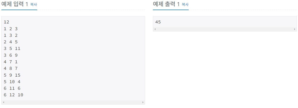 파일의 첫 번째 줄은 노드의 개수 n(1 ≤ n ≤ 10,000)이다. 둘째 줄부터 n-1개의 줄에 각 간선에 대한 정보가 들어온다. 간선에 대한 정보는 세 개의 정수로 이루어져 있다. 첫 번째 정수는 간선이 연결하는 두 노드 중 부모 노드의 번호를 나타내고, 두 번째 정수는 자식 노드를, 세 번째 정수는 간선의 가중치를 나타낸다. 간선에 대한 정보는 부모 노드의 번호가 작은 것이 먼저 입력되고, 부모 노드의 번호가 같으면 자식 노드의 번호가 작은 것이 먼저 입력된다. 루트 노드의 번호는 항상 1이라고 가정하며, 간선의 가중치는 100보다 크지 않은 양의 정수이다.