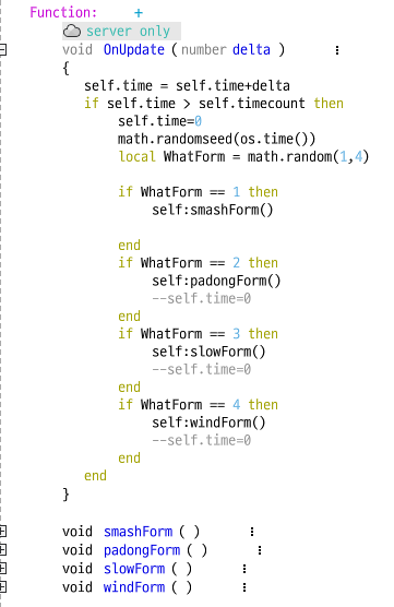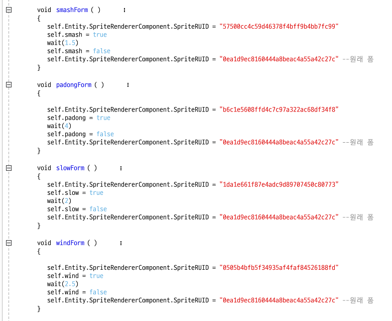 OnUpdate함수는 다음과 같으며 1~4까지 숫자를 랜덤으로 돌려 나온 숫자에 맞춰 폼을 바꿔주어 애니메이션을 실행한다.