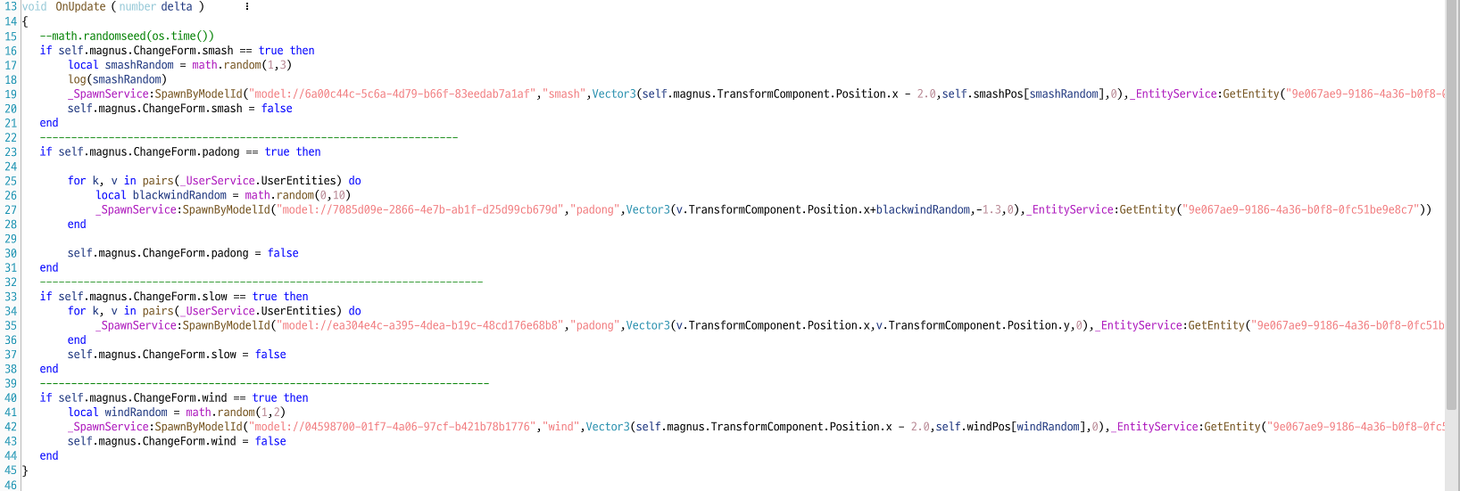 매그너스의 패턴이 발동 될 시 해당 폼이 true이면 _SpawnService:SpawnByModelId 를 통해 장애물을 소환한다.