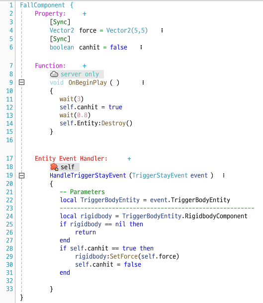 떨어지는 장애물에도 새로운 컴포넌트를 추가해주고 생성되고 3초 동안 기다리고 3초 뒤에 canhit 변수를 true로 바꿔줘서 닿았을 때 튕겨나도록 한다.