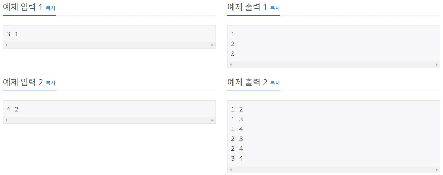 첫째 줄에 자연수 N과 M이 주어진다. (1 ≤ M ≤ N ≤ 8)