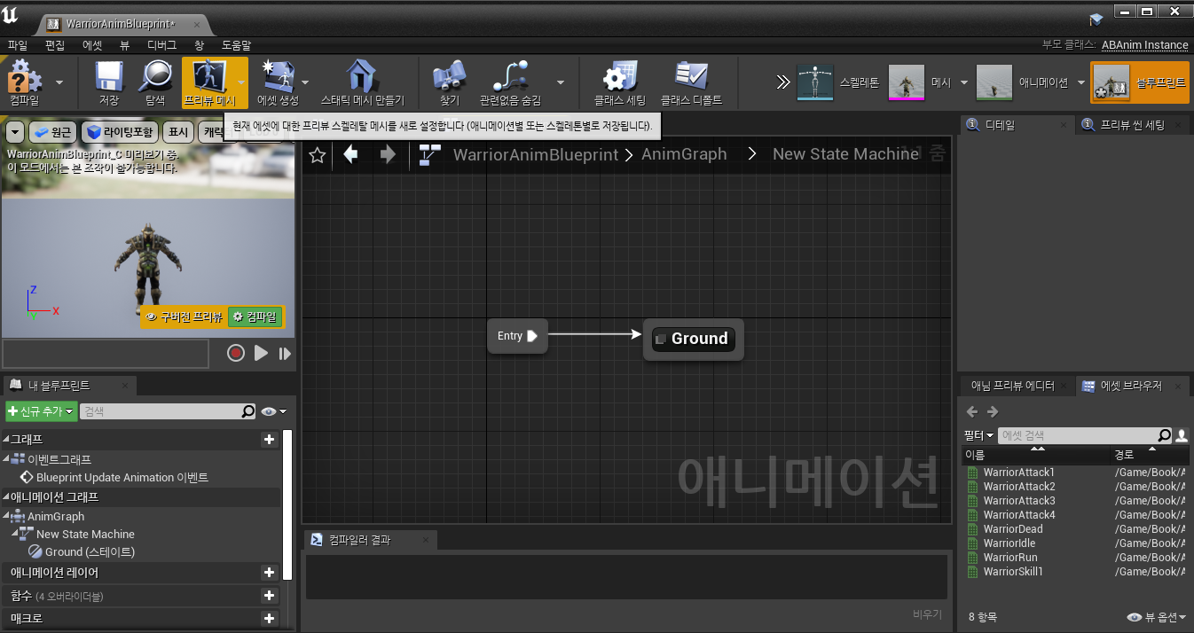 Ground 에서 Jump 로 이동할 것이고 IsInAir가 False일 경우 다시 Jump에서 Ground로 애니메이션이 이동하게 노드를 짜준다.