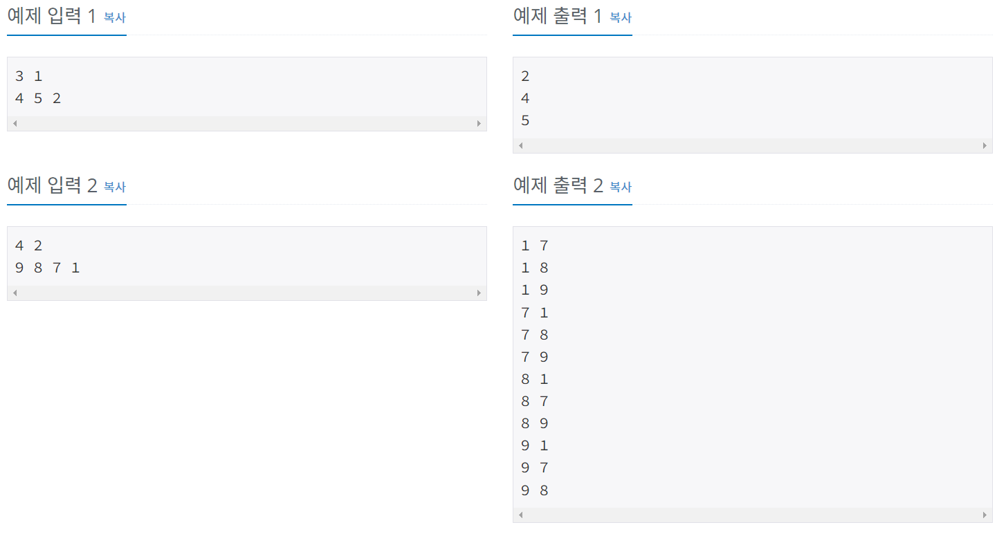 첫째 줄에 N과 M이 주어진다. (1 ≤ M ≤ N ≤ 8)