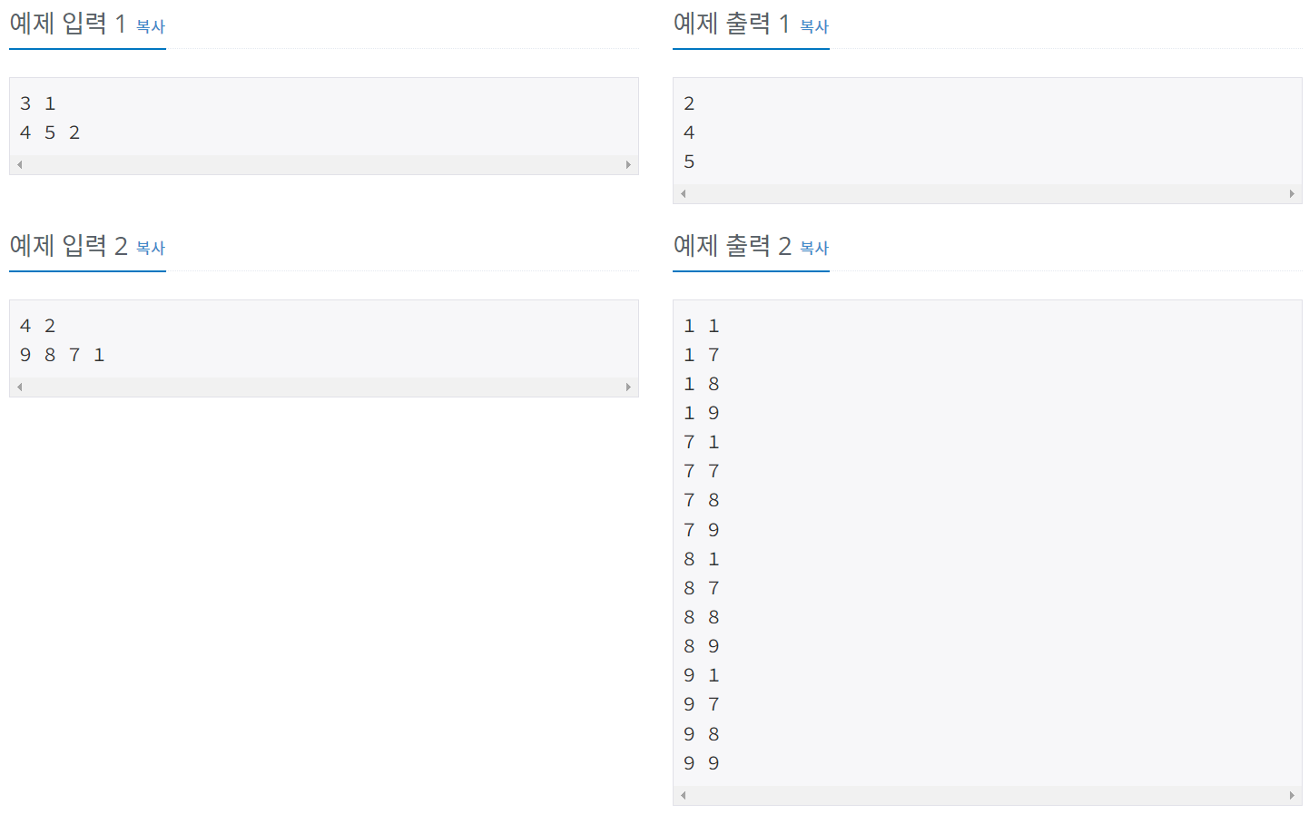 첫째 줄에 N과 M이 주어진다. (1 ≤ M ≤ N ≤ 7)