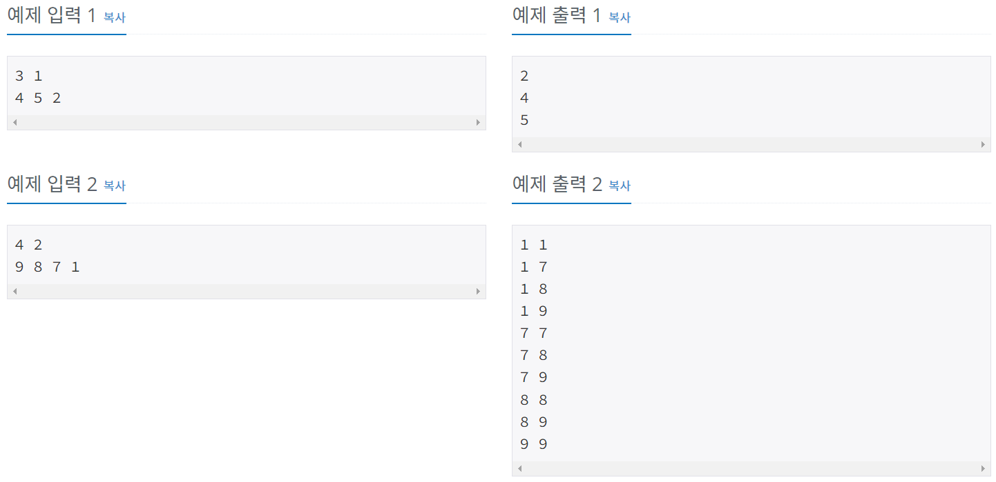 첫째 줄에 N과 M이 주어진다. (1 ≤ M ≤ N ≤ 8)