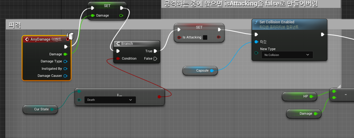 다음과 같이 AnyDamage이벤트 발생 시 isAttacking변수를 false로 바꾸어 피격 시 nuckback애니메이션이 실행되도록 한다