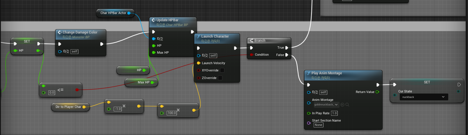 또 피격 시 이 부분 미리 normalize를 통해 구한 방향 변수 DirtoPlayChar에 -100만큼 뒤로 힘을 가하는 LaunchCharacter를 통해 뒤로 100만큼 밀려 나도록 설정한다