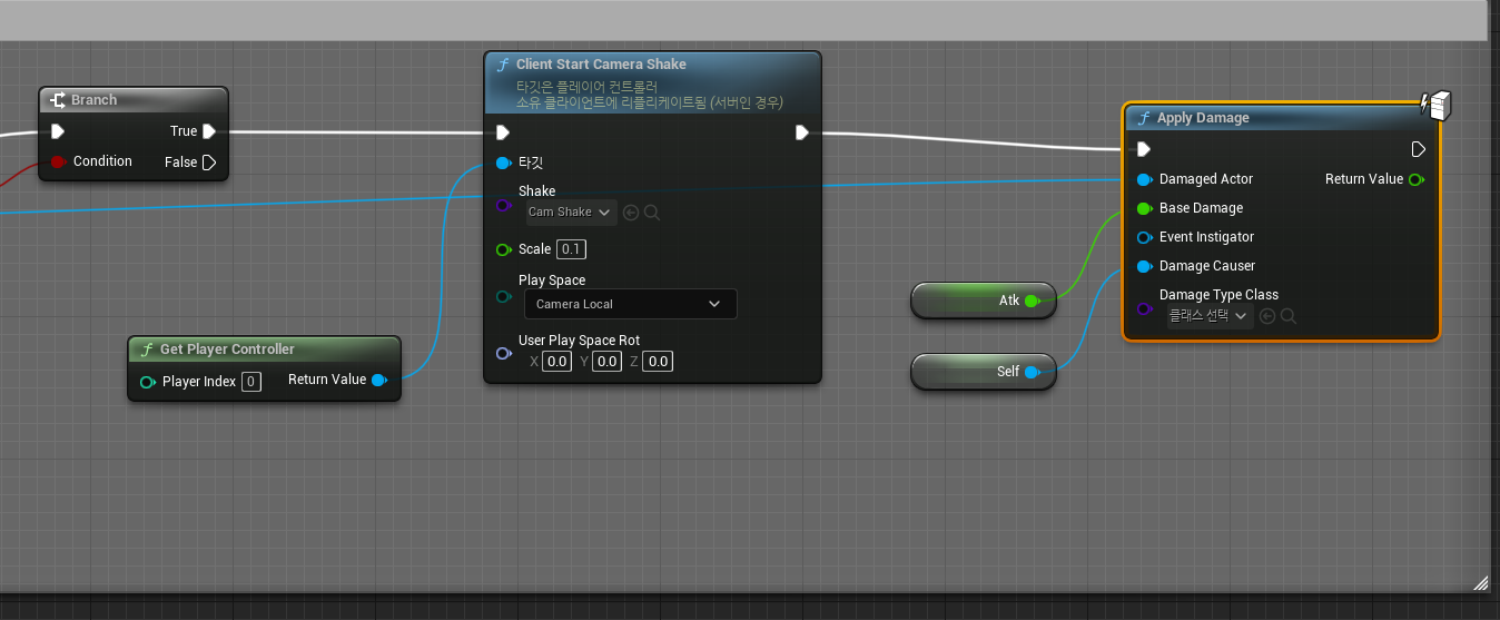 캐릭터 블루프린트로 가서 데미지를 적용하는 Apply Damage바로 앞에 Client Start Camera Shake를 추가해주고 Shake란에는 방금 생성한 CamShake블루프린트를 넣어준다