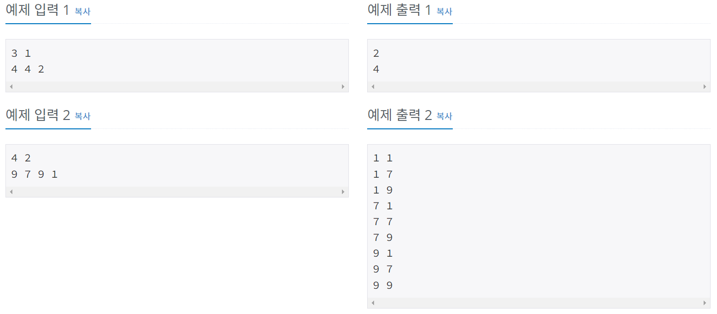 첫째 줄에 N과 M이 주어진다. (1 ≤ M ≤ N ≤ 7)