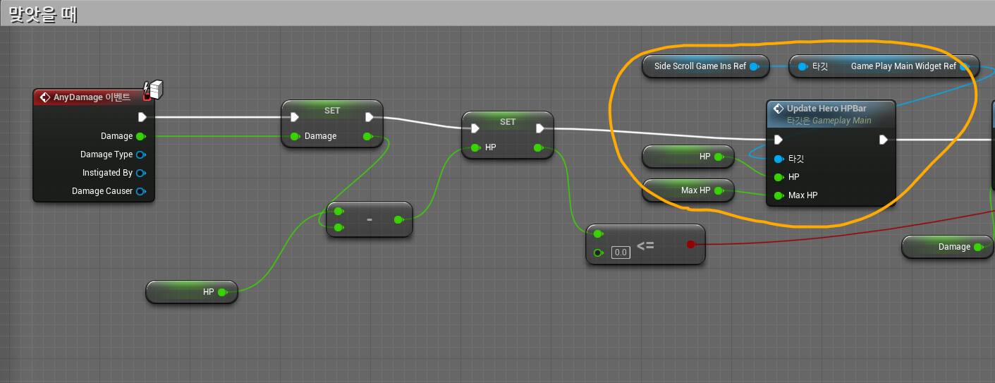 맞았을 때 위에 생성한 함수를 호출하기 위해 AnyDamage이벤트가 발생했을 때 노드를 연결해준다.