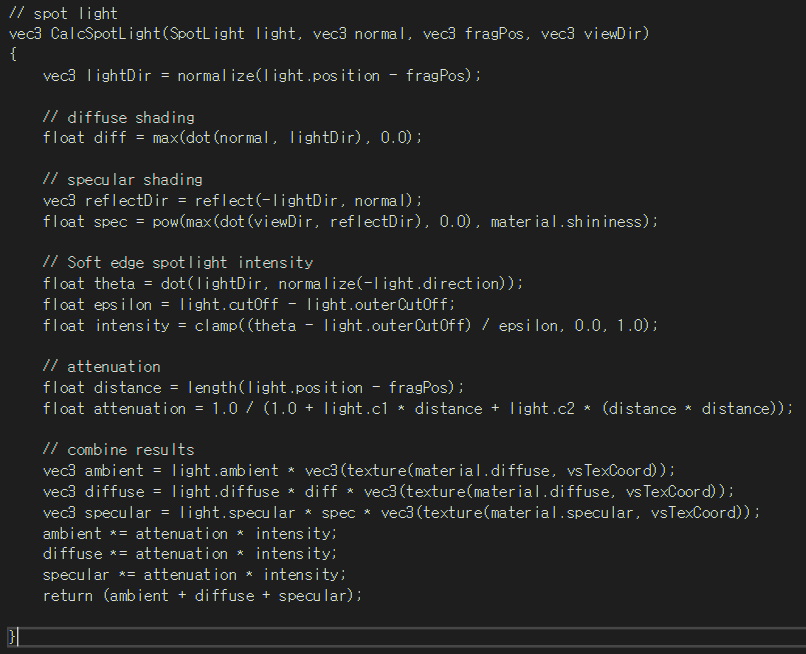 vec3 CalcSpotLight(SpotLight light, vec3 normal, vec3 fragPos, vec3 viewDir);