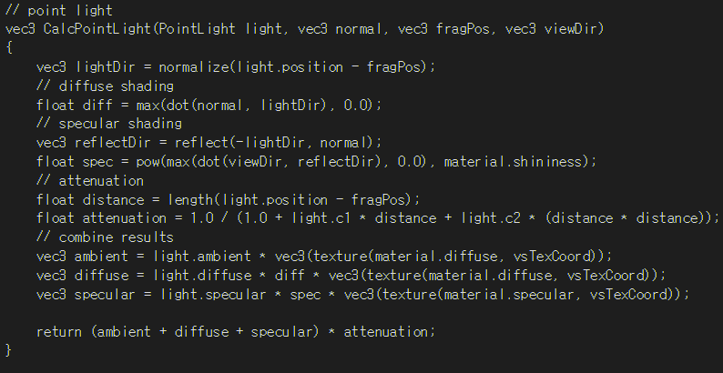 vec3 CalcPointLight(PointLight light, vec3 normal, vec3 fragPos, vec3 viewDir);