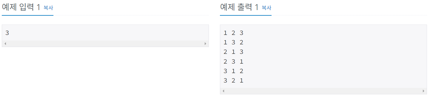 첫째 줄부터 N!개의 줄에 걸쳐서 모든 순열을 사전순으로 출력한다.