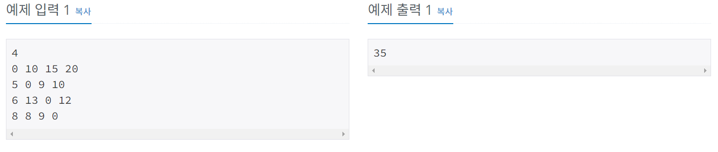 N과 비용 행렬이 주어졌을 때, 가장 적은 비용을 들이는 외판원의 순회 여행 경로를 구하는 프로그램을 작성하시오.