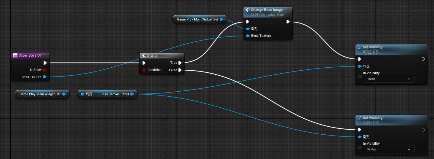 틱 이벤트에서 보스가 캐릭터와의 거리가 500 이하일 때 쫓아가는 부분의 노드에 Show Boss UI 함수를 연결하고 isShow를 true로 만들어 캐릭터와 가까워 질 때만 보스 UI가 생성되도록한다.