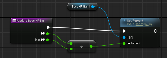 보스도 마찬가지로 Any Damage이벤트에서 함수처리를 통해 프로그레스 바가 현재 체력 상황에 따라 달라지도록 노드를 연결해준다.