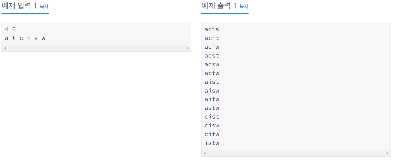 첫째 줄에 두 정수 L, C가 주어진다. (3 ≤ L ≤ C ≤ 15) 다음 줄에는 C개의 문자들이 공백으로 구분되어 주어진다. 주어지는 문자들은 알파벳 소문자이며, 중복되는 것은 없다.