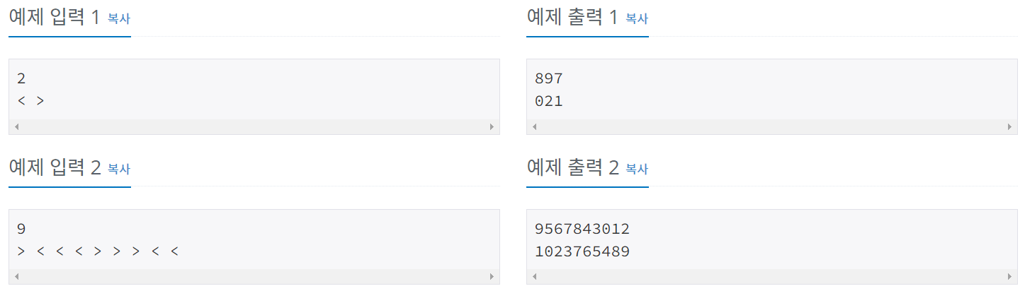 여러분은 제시된 부등호 관계를 만족하는 k+1 자리의 최대, 최소 정수를 첫째 줄과 둘째 줄에 각각 출력해야 한다. 단 아래 예(1)과 같이 첫 자리가 0인 경우도 정수에 포함되어야 한다. 모든 입력에 답은 항상 존재하며 출력 정수는 하나의 문자열이 되도록 해야 한다.