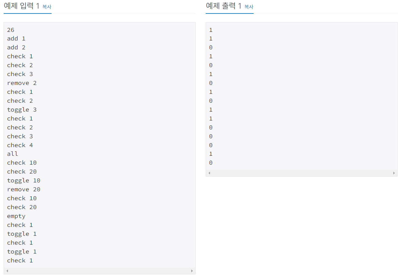 - toggle x: S에 x가 있으면 x를 제거하고, 없으면 x를 추가한다. (1 ≤ x ≤ 20)