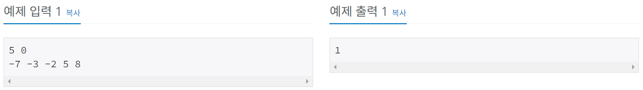 첫째 줄에 정수의 개수를 나타내는 N과 정수 S가 주어진다. (1 ≤ N ≤ 20, |S| ≤ 1,000,000) 둘째 줄에 N개의 정수가 빈 칸을 사이에 두고 주어진다. 주어지는 정수의 절댓값은 100,000을 넘지 않는다.