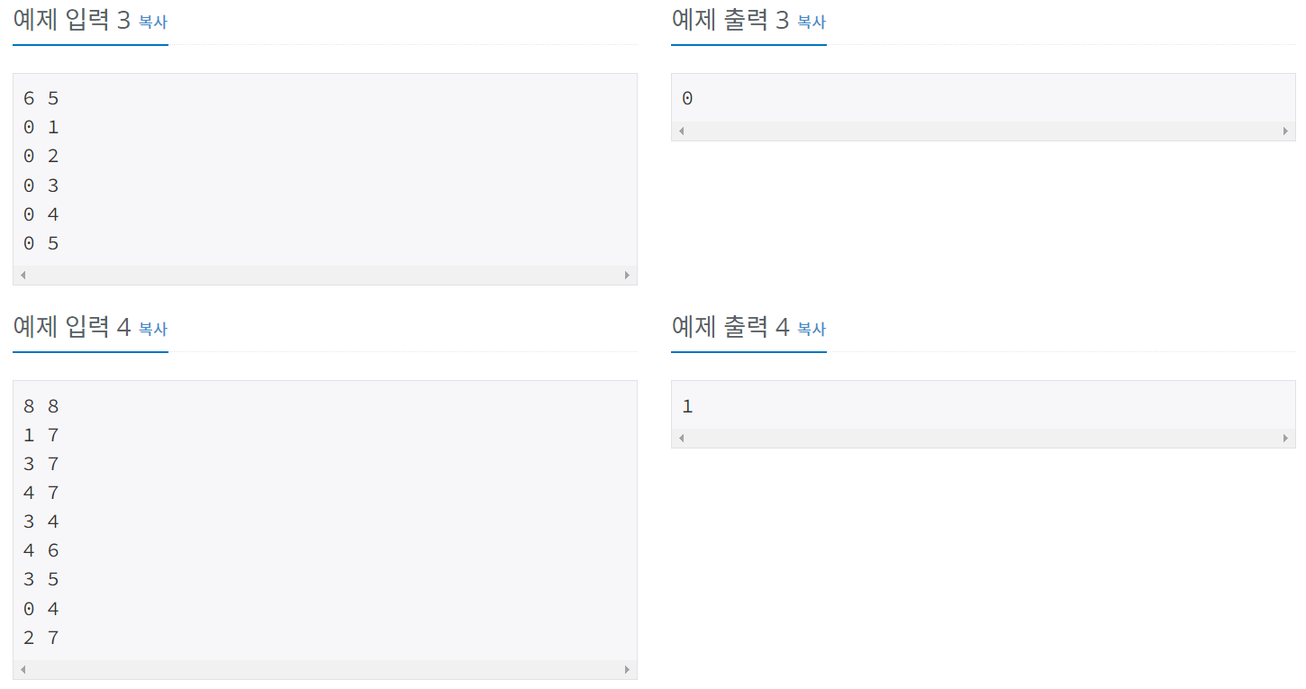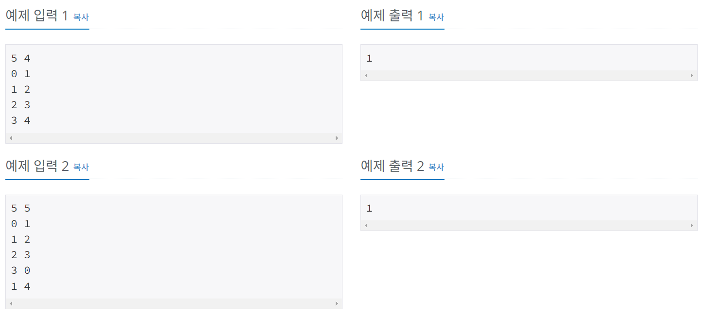 둘째 줄부터 M개의 줄에는 정수 a와 b가 주어지며, a와 b가 친구라는 뜻이다. (0 ≤ a, b ≤ N-1, a ≠ b) 같은 친구 관계가 두 번 이상 주어지는 경우는 없다.