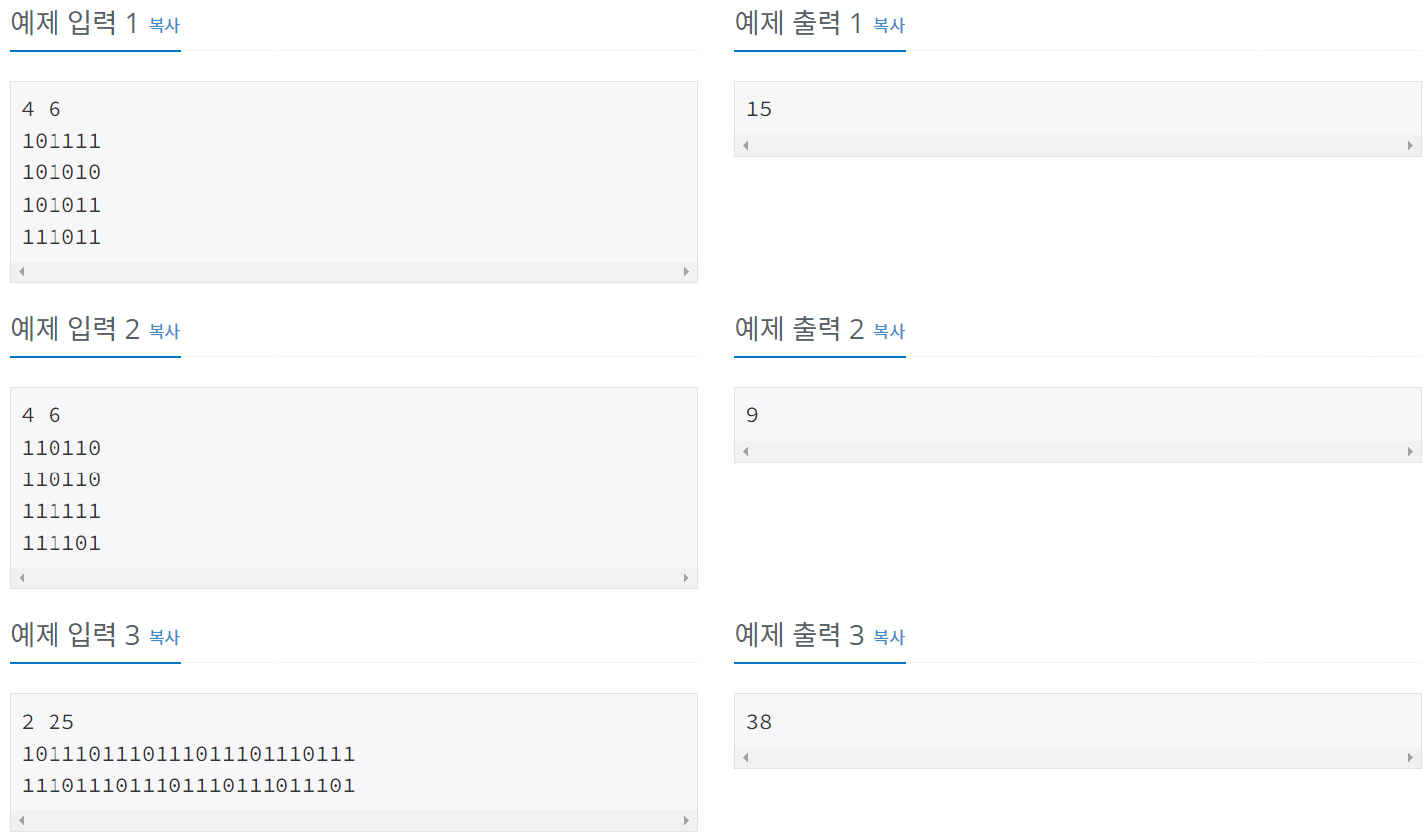 첫째 줄에 두 정수 N, M(2 ≤ N, M ≤ 100)이 주어진다. 다음 N개의 줄에는 M개의 정수로 미로가 주어진다. 각각의 수들은 붙어서 입력으로 주어진다.
