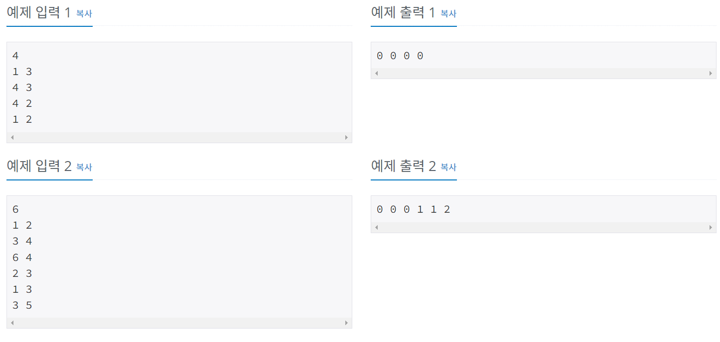 총 N개의 정수를 출력한다. 1번 역과 순환선 사이의 거리, 2번 역과 순환선 사이의 거리, ..., N번 역과 순환선 사이의 거리를 공백으로 구분해 출력한다.
