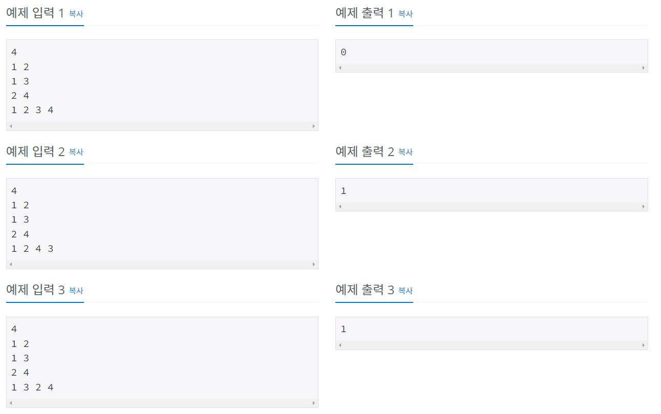 첫째 줄에 정점의 수 N(2 ≤ N ≤ 100,000)이 주어진다. 둘째 줄부터 N-1개의 줄에는 트리의 간선 정보가 주어진다. 마지막 줄에는 DFS 방문 순서가 주어진다. DFS 방문 순서는 항상 N개의 정수로 이루어져 있으며, 1부터 N까지 자연수가 한 번씩 등장한다.