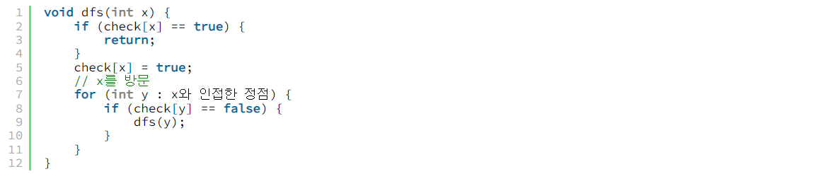 정점의 개수가 N이고, 정점에 1부터 N까지 번호가 매겨져있는 양방향 그래프가 있을 때, DFS 알고리즘은 다음과 같은 형태로 이루어져 있다.