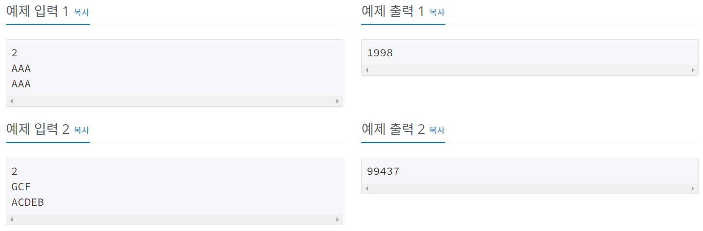 첫째 줄에 단어의 개수 N(1 ≤ N ≤ 10)이 주어진다. 둘째 줄부터 N개의 줄에 단어가 한 줄에 하나씩 주어진다. 단어는 알파벳 대문자로만 이루어져있다. 모든 단어에 포함되어 있는 알파벳은 최대