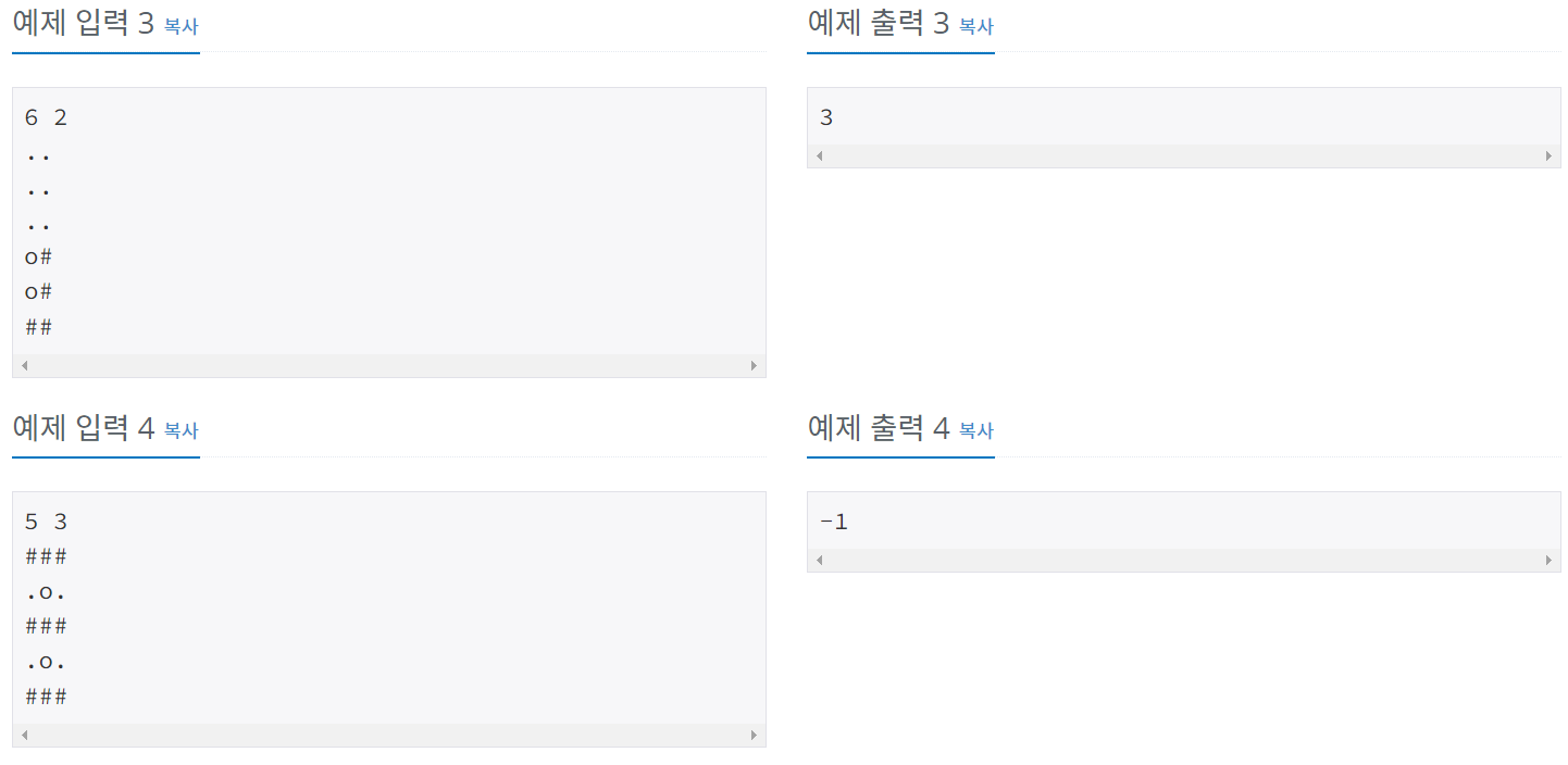 첫째 줄에 두 동전 중 하나만 보드에서 떨어뜨리기 위해 눌러야 하는 버튼의 최소 횟수를 출력한다. 만약, 두 동전을 떨어뜨릴 수 없거나, 버튼을 10번보다 많이 눌러야 한다면, -1을 출력한다.