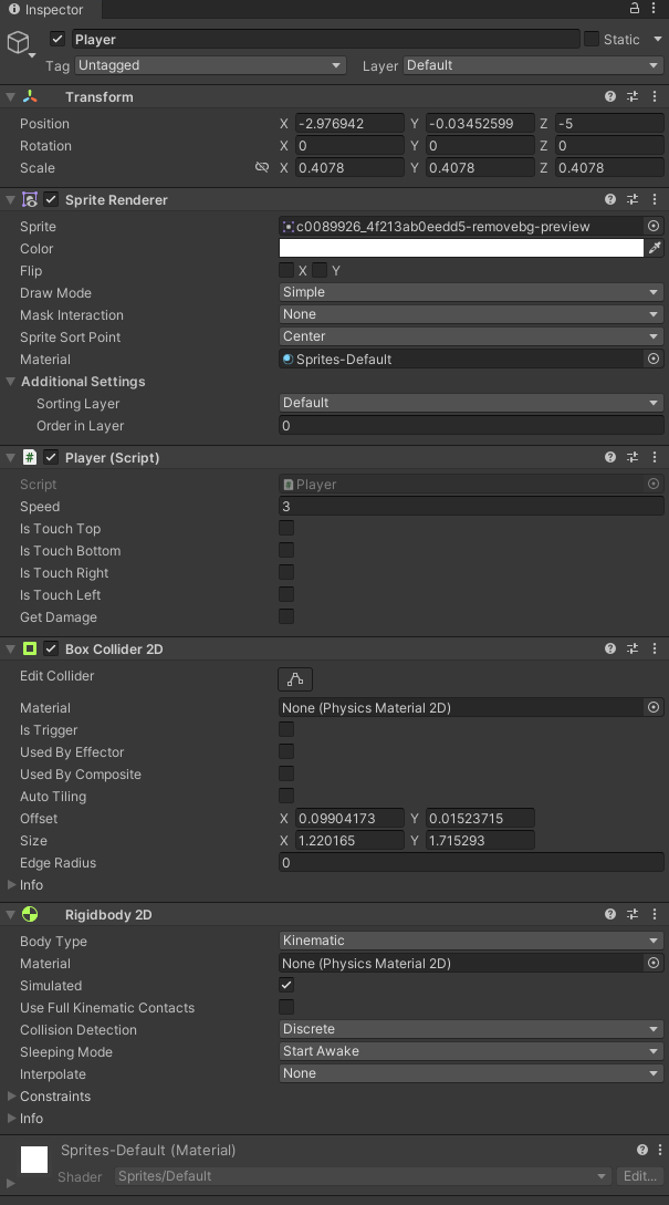 Rigidbody - 플레이어에게 힘을 주기 위한 컴포넌트(실질적인 이동) BodyType은 스크립트로 제어 할 것이기 때문에 Kinematic으로 설정해둔다.