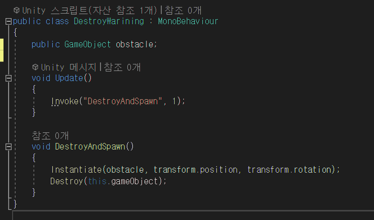 Invoke를 통해 1초뒤에 해당 위치에 장애물을 소환하고 자신을 삭제하도록하는 스크립트를 추가한다.