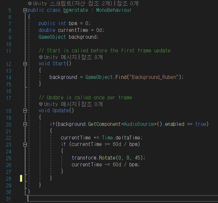 노래가 켜졌을 때, 60/bpm만큼의 시간이 지났을 때 45도 오브젝트를 회전하도록한다.