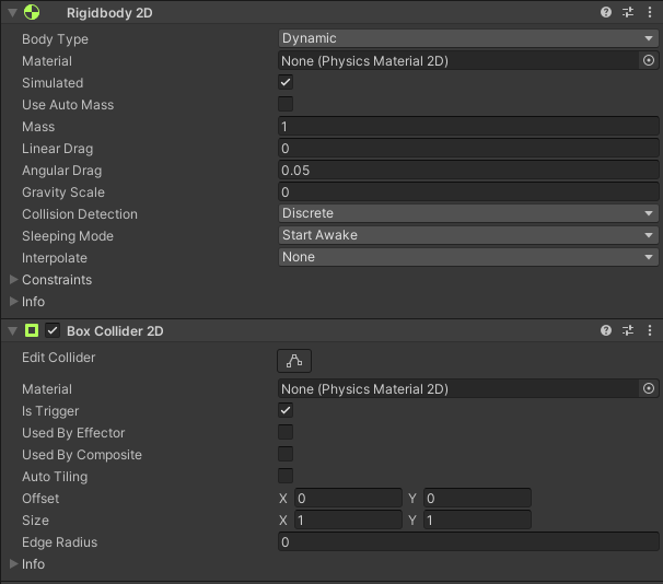 경고 오브젝트와 다르게 Rigidbody 와 Collider 컴포넌트를 추가하고 IsTrigger를 선택한다.