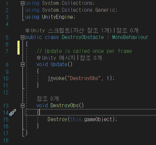 Invoke를 통해 1초뒤 자신을 삭제시키도록 한다.