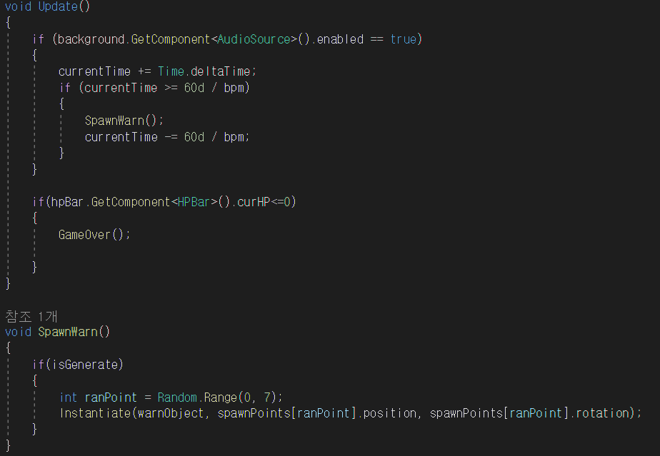 이 SpawnWarn 함수는 Update에서 일정 시간이 지나야만 실행되도록 코드를 작성한다.