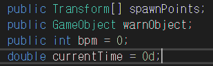 GameManager 스크립트의 변수 선언은 다음과 같다.